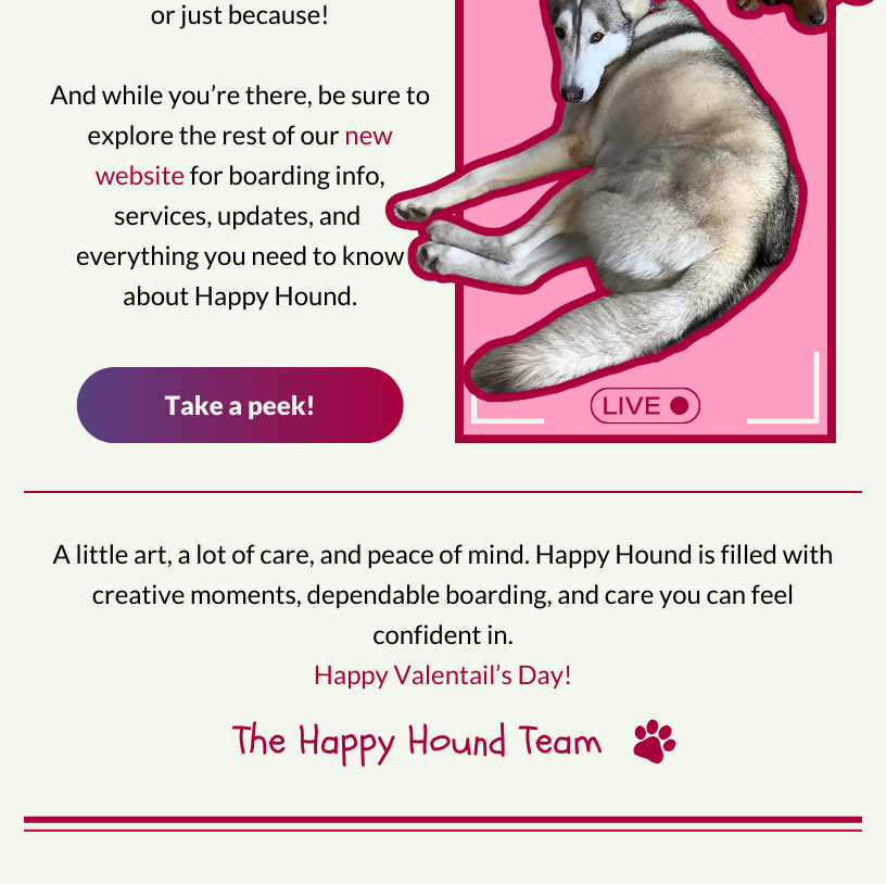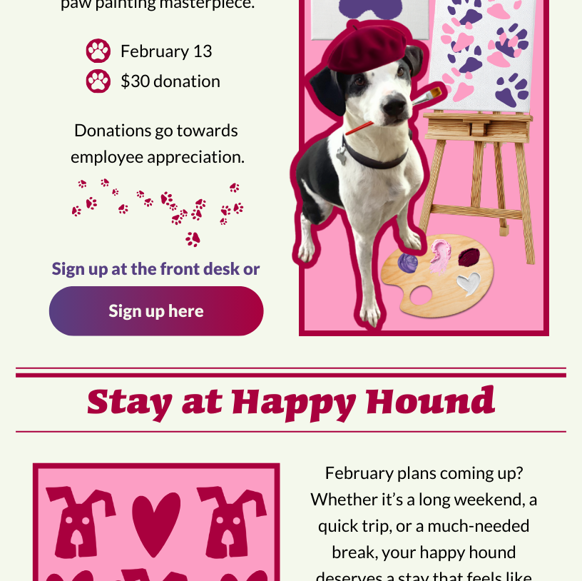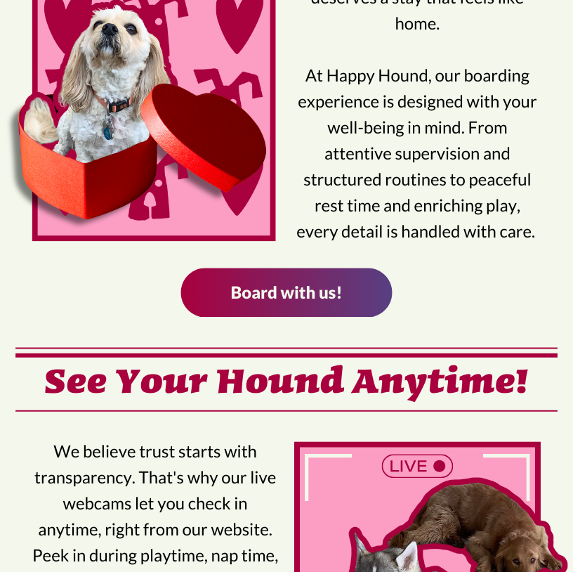 As a thank you for helping provide a safe space for furry friends in need, we’ll snap a heart-filled pic of your best friend posed against our special Valentine’s backdrop. We’ll send you a copy of the pic and may even post it to our Facebook page or website.Help us spread the love — grab the leash and head on over to Happy Hound dog daycare and make this a very special Valentine’s.